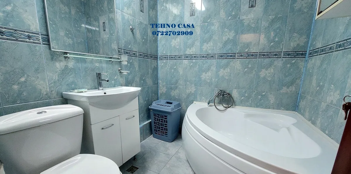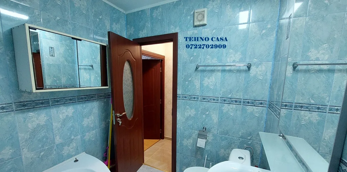 Bucataria este inchisa, mobilata si utilata complet (plita, cuptor, hota, frigider, etc), dormitorul mare este dotat cu pat matrimonial cu saltea noua, dulap haine spatios, in dormitorul mic este pat de 1 persoana cu saltea noua, biblioteca si birou, livingul are set canpea extensibila tip coltar si doua fotolii, biblioteca, televizor, etc., din sufragerie se iese in balcon (balcon spatios pe latimea sufrageriei si a dormitorului mare), baia mare este cu cada.
