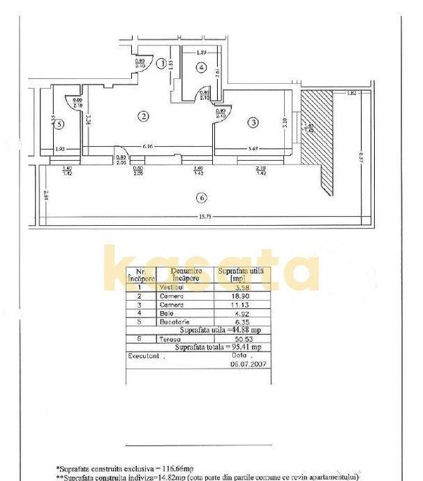 Iti propunem un apartament de 2 camere care se diferentiaza clar printr-un atu rar terasa generoasa de 50 53 mp ideala pentru zona de lounge dining gradina urbana sau spatiu de joaca Locuinta are o compartimentare practica si luminoasa fiind potrivita atat pentru locuire cat si pentru investitie Suprafate conform releveu Suprafata utila 44 88 mp Terasa 50 53 mp Total 95 41 mp Living 18 90 mp Dormitor 11 13 mp Bucatarie separata 6 35 mp Baie 4 92 mp Hol/vestibul 3 58 mp Se vinde cu 2 locuri de parcare 11 50 mp si 10 80 mp -- un avantaj important in zona Terasa mare bucatarie separata doua parcari o proprietate foarte buna pentru cei care isi doresc spatiu exterior real fara compromisuri Programeaza o vizionare cat inca este disponibil Terasa de 50 53 mp si cele 2 locuri de parcare sunt atuuri greu de gasit