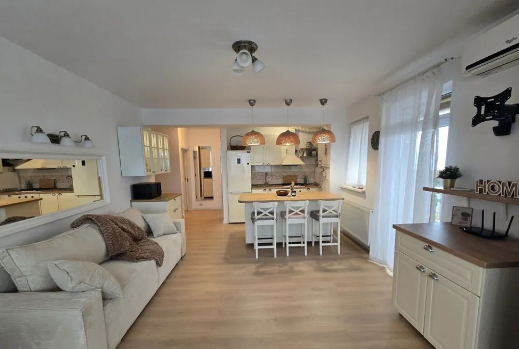 Proprietatea a fost renovata complet in noiembrie 2025 si amenajata cu ajutorul unui designer. Suprafata utila este de 70,17 mp, iar suprafata totala ajunge la 83 mp, incluzand un balcon inchis (unde este montat aerul conditionat si caloriferul) si un balcon deschis. Apartamentul beneficiaza de doua locuri de parcare: unul subteran si unul suprateran.
