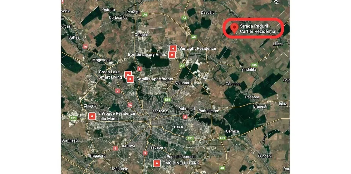 Oportunitate rara: unul dintre cele mai generoase loturi disponibile intr-un cartier rezidential deosebit din Afumati, la liziera Padurii Golasei! Terenul masoara 1133 de metri patrati, suficienti pentru o locuinta permanenta sau de vacanta intr-o zona linistita si cu aer curat.Ceea ce face acest loc cu adevarat special este felul in care imbina intimitatea cu accesul rapid. Desi esti inconjurat de verdeata, te afli la doar un pas de agitatia orasului. Accesul pe Autostrada A3 te scuteste de multe ore pierdute in trafic, asigurand acces rapid catre zona Pipera, Promenada Mall sau Aeroportul Otopeni.