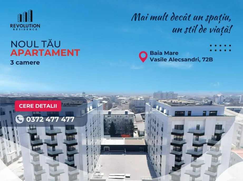 Descopera cel mai nou si modern complex rezidential REVOLUTION PLAZA TOWER 2, situat in zona Catedralei Sfanta Treime, pe strada Vasile Alecsandri 72B din Baia Mare, un proiect marca Revolution Residence.