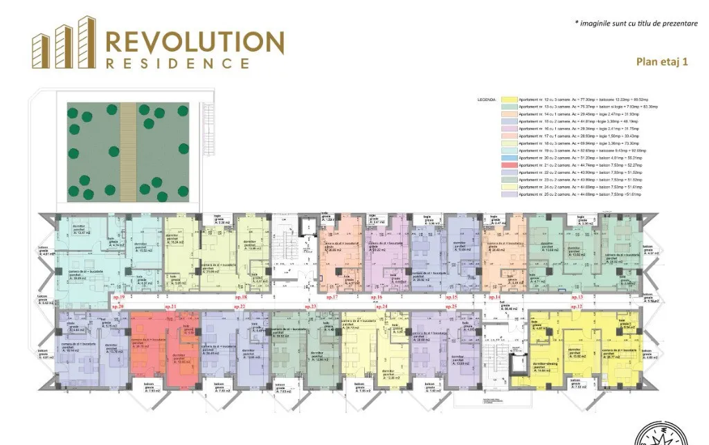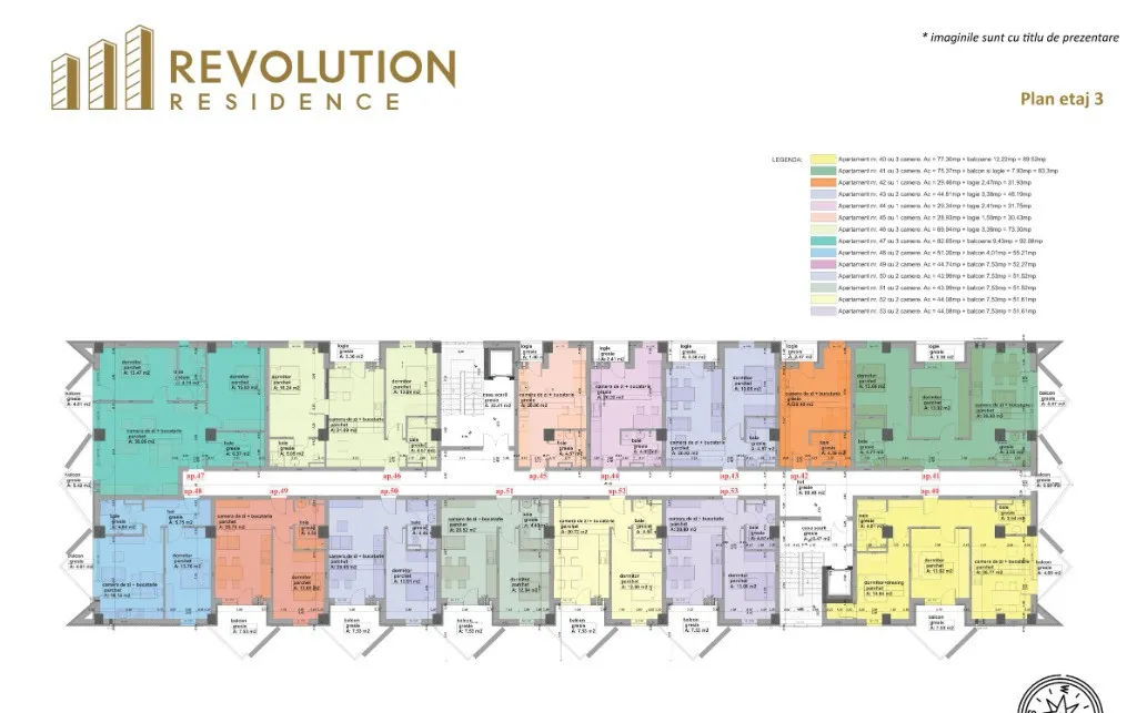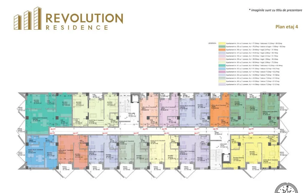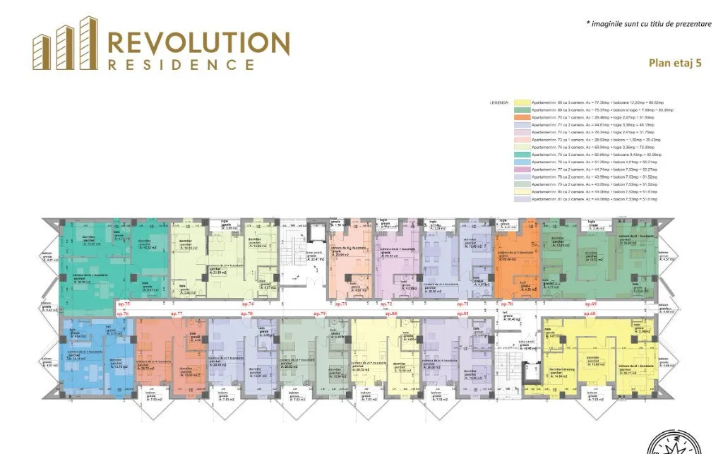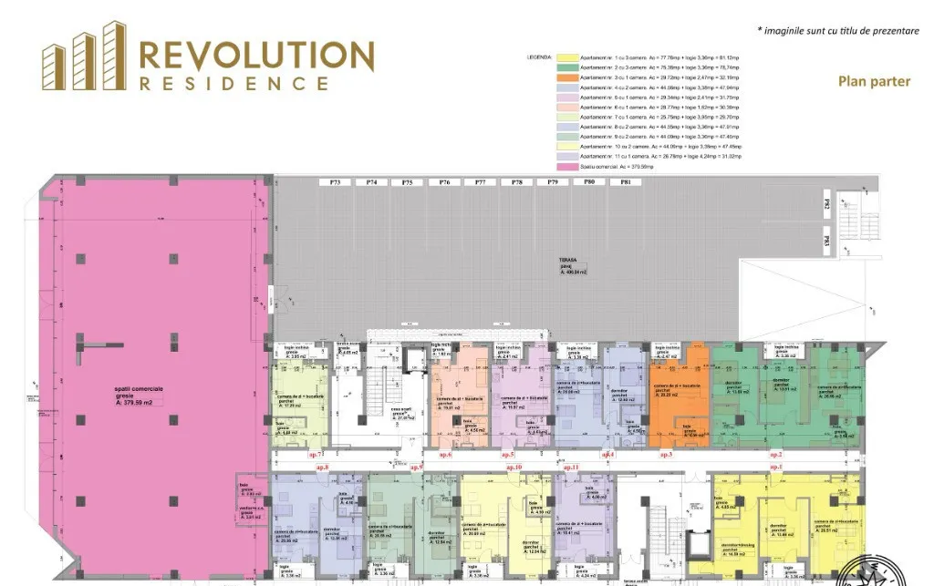 Va propunem spre vanzare apartamente cu 3 camere ce au o suprafata cuprinsa intre 69.94mpc si 100.79 mpc plus terasa cu suprafete cuprinse intre 3.36mpc si 44.03mpc.