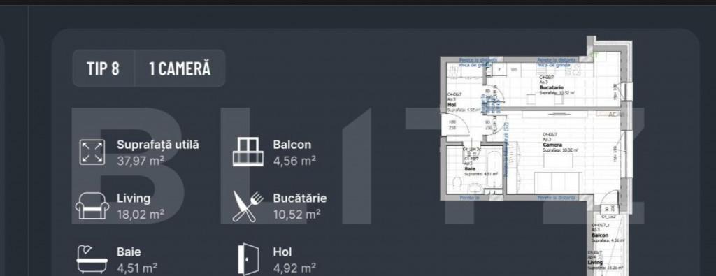 Blitz va prezinta un apartament modern si elegant perfect pentru persoanele in cautarea unui camin confortabil si bine pozitionat Acest apartament cu 1 camera avand o suprafata utila de 37 07 mp si un balcon de 8 52 mp se remarca prin finisaje premium si dotari de inalta calitate Intre caracteristicile deosebite ale apartamentului se numara Centrala proprie - pentru confortul dumneavoastra termic si economie la facturi Aer conditionat - pentru o atmosfera placuta in orice sezon Incalzire in pardoseala - o solutie moderna si eficienta pentru incalzirea uniforma a locuintei Finisaje premium - fiecare detaliu este realizat cu atentie pentru a oferi un ambient elegant si rafinat Cladire certificata Clasa A - construirea la cele mai inalte standarde garantand performanta energetica superioara si siguranta in exploatare Proiectul este realizat la cele mai mari standarde de calitate iar amplasarea intr-o zona accesibila si linistita face din acest apartament o oportunitate excelenta de a investi intr-o locuinta moderna si confortabila Nu ratati ocazia de a deveni proprietarul acestui apartament deosebit Contactati Blitz pentru mai multe informatii si pentru a programa o vizionare Cod oferta / ID BLITZ P142582 Id intern P142582