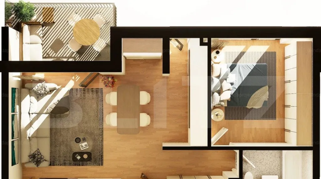 Apartamentul are o suprafață de 53 mp, fiind compartimentat astfel: living cu bucatarie open space, dormitor, baie, hol si un balcon generos.