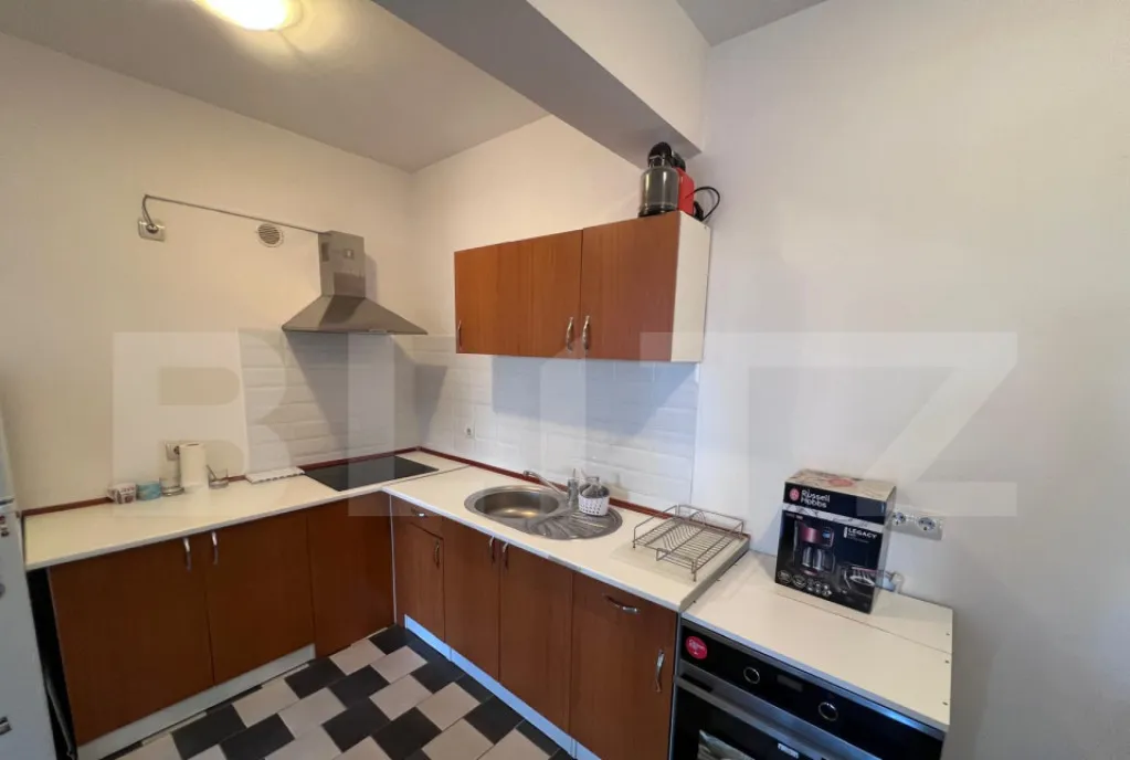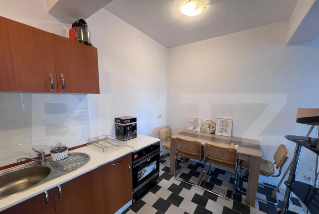 Locuința se închiriază complet mobilată și utilată, bucătăria fiind dotată cu plită electrică, hotă și cuptor electric, fiind pregătită pentru mutare imediată.