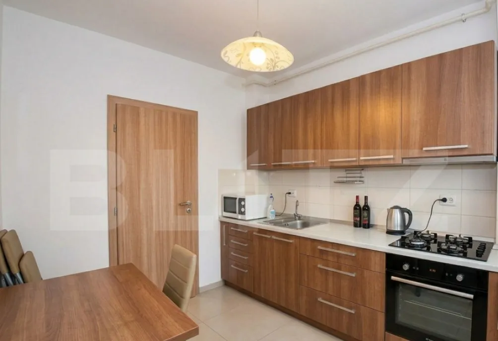 – Bucatarie inchisa, complet mobilata si utilata: aragaz electric, cuptor, hota, frigider si cuptor cu microunde
