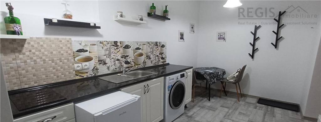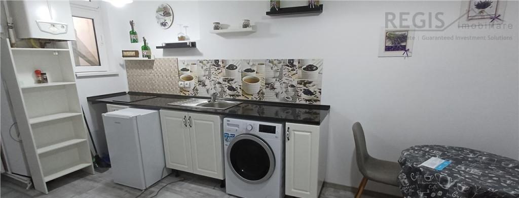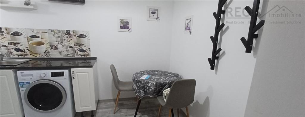 Apartament de inchiriat cu 2 camere gradina si loc de parcare in zona Calea Surii Mici din Sibiu Locuinta este decomandata si are suprafata de 39 mp utili impartiti in hol living open space bucatarie dormitor si baie Separat de suprafata utila apartamentul detine o curte de 18 mp cu terasa pe care intrarea se face atat din living cat si din dormitor Designul interior al apartamentului este modern cu finisaje precum pereti zugraviti in culori vii pentru contrast cu riflaje de lemn montate in dormitor tapet decorativ in baie pardoselile acoperite cu gresie si parchet Acesta este dotat cu centrala termica proprie incalzire in pardoseala aer conditionat termostat lustre de calitate prize si intrerupatoare usa de acces metalica ier cele interioare din lemn ferestre cu tamplarie PVC si sticla termopan Locuinta se preda complet mobilata si utilata astfel bucataria echipata cu plita si cuptor electric hota frigider masina de spalat rufe si uscator sufrager...