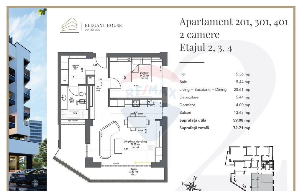 Cu o locatie de exceptie pe Bulevardul 15 Noiembrie nr 71-73 Elegant House continua sa redefineasca standardele locuirii urbane moderne in inima Centrului Civic al Brasovului La doar cativa pasi de AFI Palace Brasov acest apartament cu 2 camere ofera un stil de viata contemporan in care confortul designul inteligent si accesibilitatea se imbina armonios Situat la etajul 2 apartamentul de 2 camere combina eleganta cu functionalitatea fiind ideal atat pentru cupluri cat si pentru investitori interesati de proiecte boutique cu randamente solide Privelistea spectaculoasa catre Tampa adauga o nota de liniste si inspiratie completand experienta unui camin urban premium Caracteristici si compartimentare Suprafata utila de 59 mp terasa generoasa de 13 mp perfect pentru momente de relaxare sau mic dejun in aer liber Living open space cu bucataria conceput pentru a maximiza lumina naturala si fluxul spatiilor Dormitor confortabil ideal pentru odihna sau amenajare ca birou Baie moderna cu finisaje contemporane Balcon cu priveliste catre Tampa oferind un cadru relaxant si intim Inaltime libera de 2 70 m amplificand senzatia de spatiu si confort Finisaje si dotari Premium Centrala termica Vaillant cu control smart Incalzire in pardoseala Rehau Aer conditionat cu control inteligent Video-interfon color Sistem de alarma si supraveghere video in zonele comune Tamplarie PVC Salamander Parchet triplustratificat natural Prize si intrerupatoare Gewiss plus prize suplimentare in pardoseala ideale pentru spatiu de lucru sau birou acasa Fiecarui apartament ii este atribuit un loc de parcare in subsol pe platforme hidraulice Klauss Parking disponibil separat la 20 000 EUR fara TVA Cu pozitionare ultracentrala arhitectura contemporana si finisaje de calitate superioara acest apartament de 2 camere de la Elegant House reprezinta o optiune excelenta pentru cei care isi doresc un camin modern cu priveliste deosebita sau pentru investitori care cauta un proiect premium si adaptabil inclusiv pentru activitati profesionale