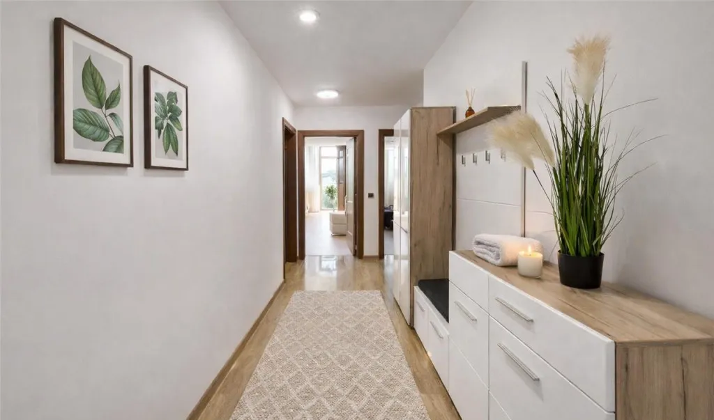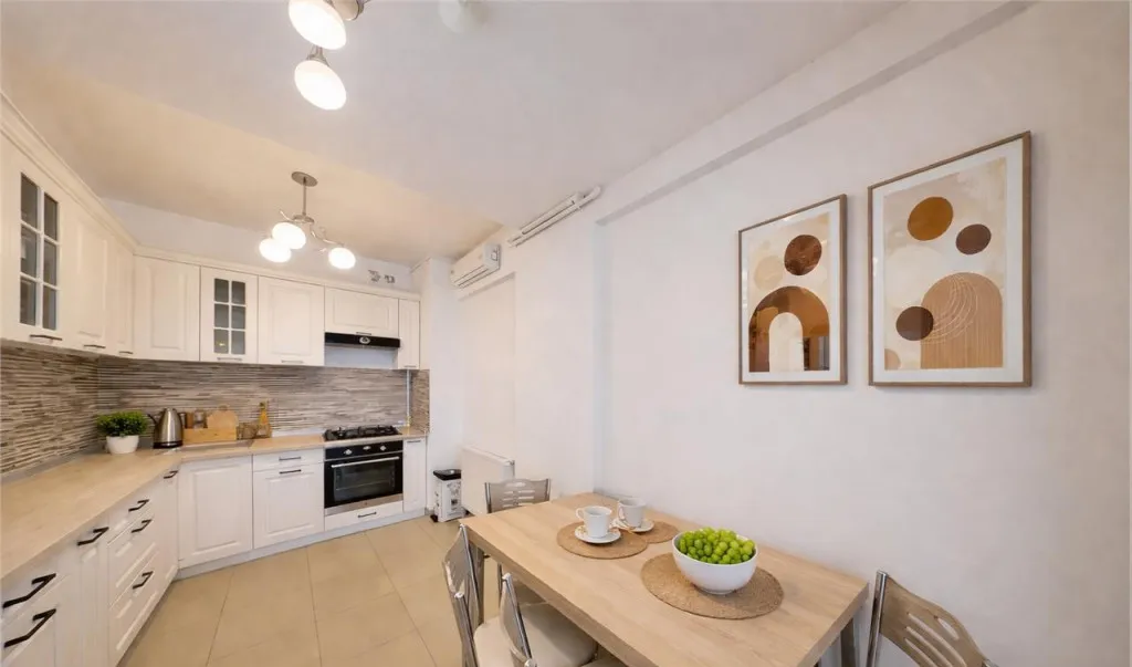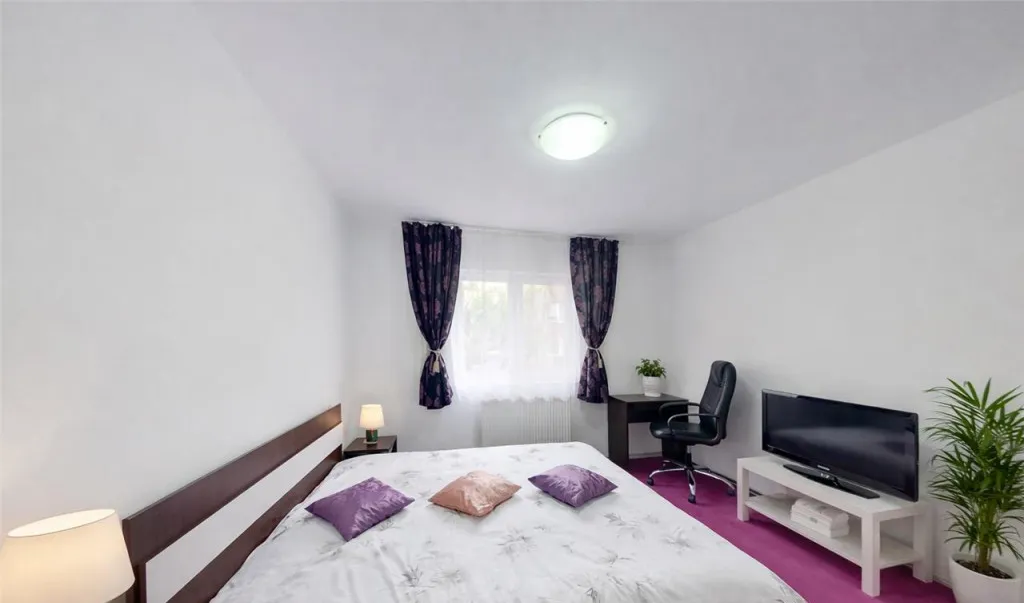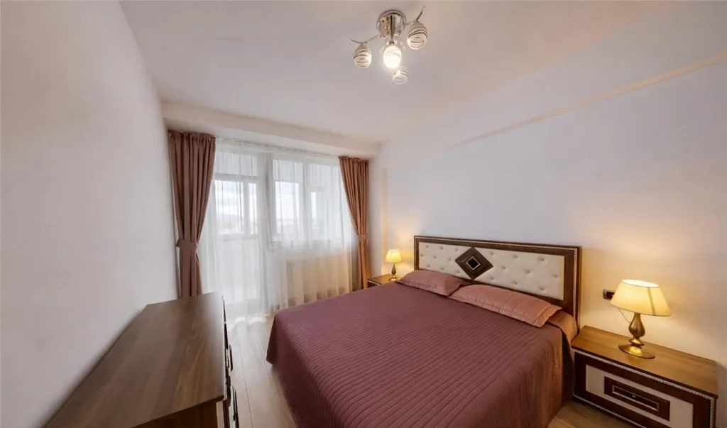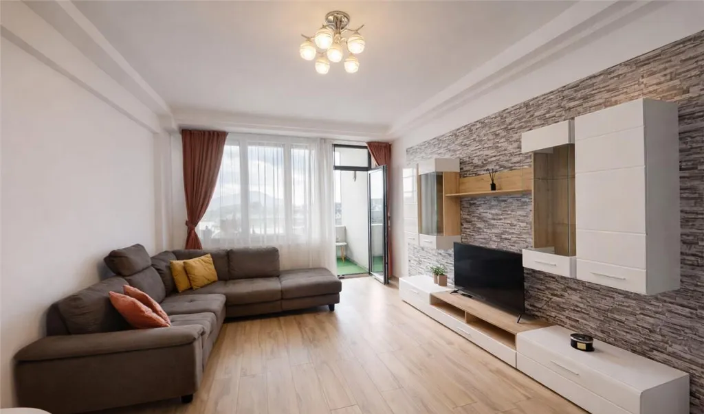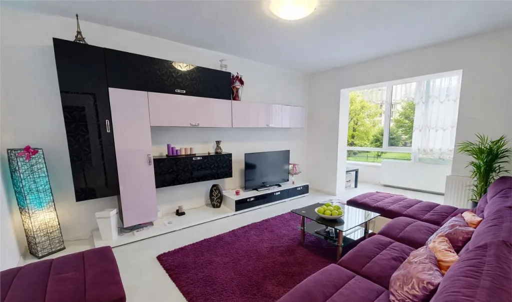 - living modern cu iesire in balcon, bucatarie echipata complet cu plita, cuptor, hota, frigider, 2 holuri generoase, doua dormitoare cu pat matrimonial, baie cu aerisire naturala si cada, precum si baie de serviciu.