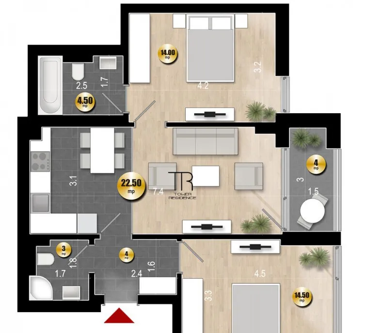 Alcatuit din: Living Bucatarie Tip Open Space de 22.5 mp, Hol 4 mp, Baie 4.5 mp, Grup Sanitar 3 mp, Dormitor 14.5 mp, Dormitor 14 mp, Terasa 4 mp.