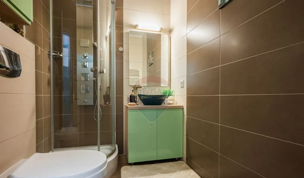 Baia aduce un plus de confort prin cabina de duș cu panel de hidromasaj, iar bideul electric completează experiența.