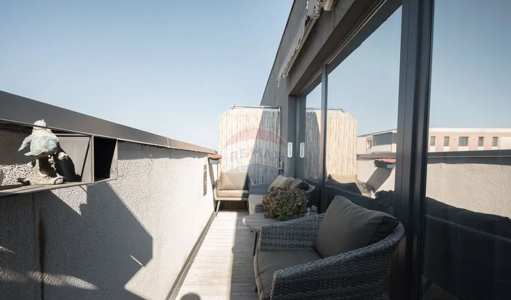 Zona de relaxare continuă și afară: balconul este amenajat cu deck și mobilier de terasă, un loc ideal pentru cafeaua de dimineață sau pentru serile liniștite.