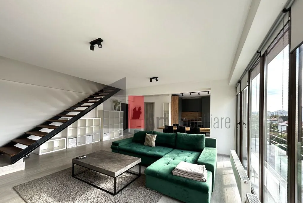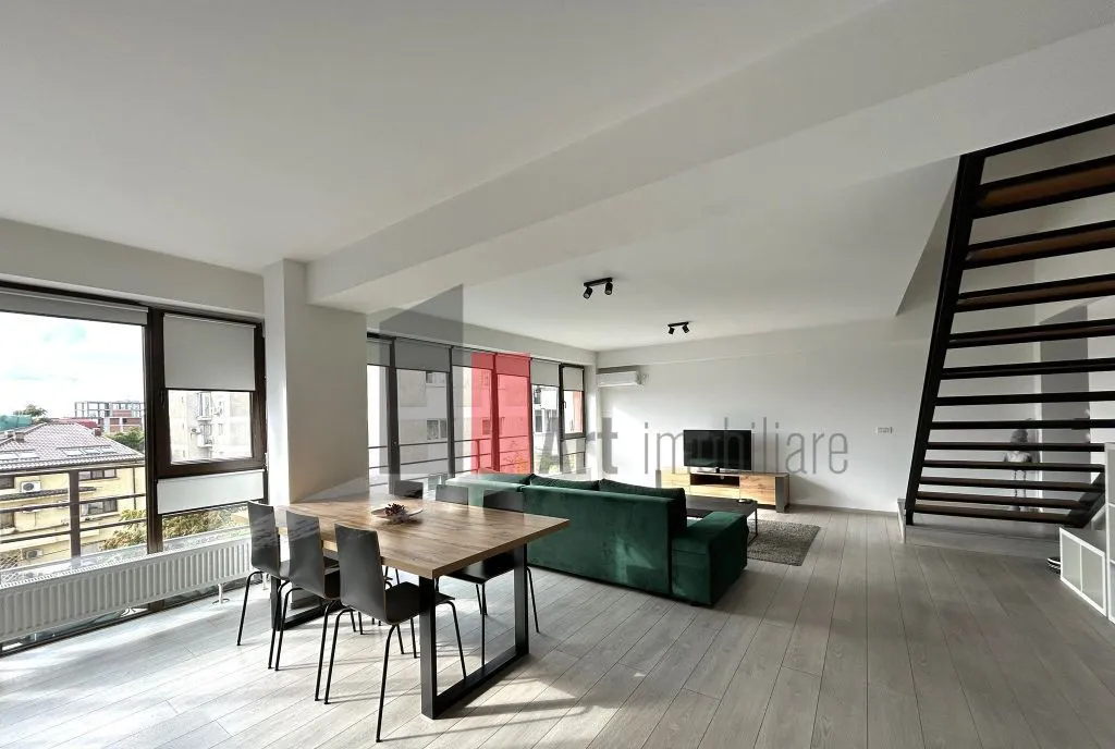 Va prezentam spre inchiriere cel mai luminos apartament de 3 camere, tip duplex, cu scara interioara, localizat la etajul 3 si Mansarda, al unui bloc construit in 2014, dotat cu lift si care include doar 10 apartamente in total. Datorita suprafetei vitrate mari si a orientarii spre sud vest, apartamentul se bucura de lumina naturala din belsug si vedere libera spre apus.