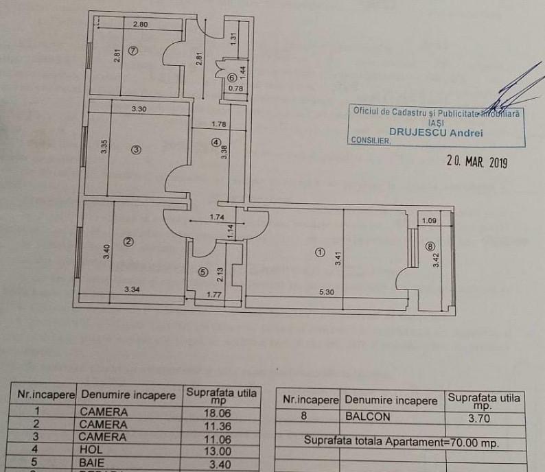 Apartament cu 3 camere situat in zona Mircea cel Batran la etajul 8 al unui bloc fara risc seismic construit in 1978 Apartamentul este foarte spatios si luminos avand o compartimentare practica ce raspunde nevoilor unei familii sau celor care cauta o investitie sigura Are o vedere deosebita catre Palatul Culturii si diferite obiective istorice ale orasului Iasi Lift nou scara curata si vecini linistiti Locuinta se preda utilata si mobilata fiind gata pentru mutare imediata necesita renovare dupa gusturile noului proprietar Incaperile beneficiaza de multa lumina naturala ceea ce creeaza o atmosfera calduroasa Zona este linistita si bine conectata la oras in apropiere se afla magazine biserici farmacii clinici medicale piata agroalimentara si mijloace de transport in comun Accesul este facil atat catre centrul orasului cat si catre iesirea spre principalele artere ceea ce ofera un plus de confort locativ Este o alegere potrivita pentru cei care isi doresc un apartament generos intr-un cartier cu toate facilitatile la indemana dar si pentru cei care urmaresc o investitie stabila pe termen lung Apartamentul este pe persoana fizica nu se percepe nici un comision suplimentar se accepta si plata prin credit ipotecar NU COLABOREZ ABSOLUT DELOC CU NICI O AGENTIE Pret 122 000 Euro negociabil