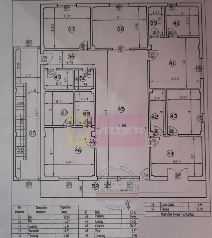 Compartimentare: living foarte spatios 55mp, 4 dormitoare luminoase cu dressing-uri, 4 bai, centrala termica, spatii de depozitare, balcon generos 23mp.