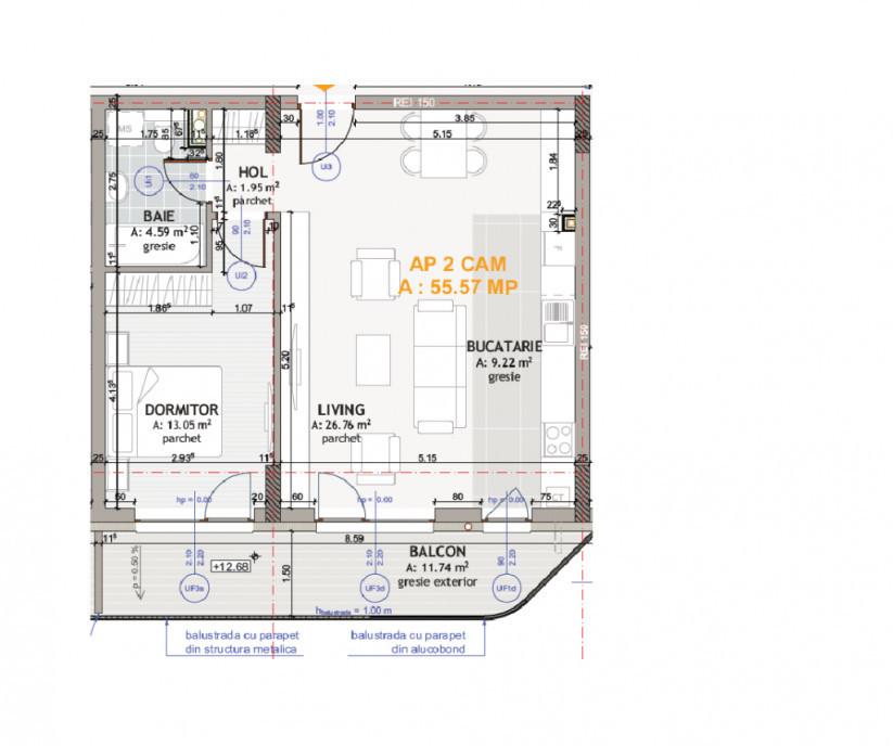 Vand apartament modern cu 2 camere situat pe Strada Eroilor in Floresti intr-un imobil nou construit in 2025 ideal atat pentru locuit cat si pentru investitie Apartamentul are suprafata utila de 55 57 mp si beneficiaza de un balcon generos de 11 74 mp fiind amplasat la etajul 3 Compartimentarea este eficienta si practica living cu bucatarie open-space dormitor baie hol balcon de 11 74 mp Imobilul se preda complet finisat mobilat si utilat fiind dotat cu electrocasnice incorporabile incalzire in pardoseala centrala termica proprie usa antiefractie geamuri termoizolante tripan Locatie foarte buna cu acces rapid catre Cluj-Napoca magazine statii de autobuz si alte puncte de interes