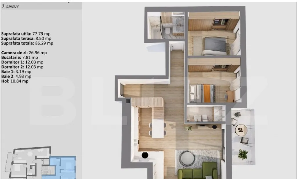 Blitz va prezinta un apartament modern de 3 camere, situat într-un ansamblu ultracentral, oferă spațiu generos, finisaje premium și eficiență energetică ridicată, fiind ideal pentru locuire sau investiție imobiliară. Cu o suprafață de 77,79 mp, orientare estică și vestică, plus o terasă de 8,5 mp, acesta beneficiază de luminozitate pe tot parcursul zilei și un spațiu perfect pentru relaxare.