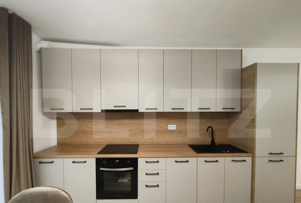 Bucatarie complet echipata cu plita electrica si masina de spalat vase. Se poate instala TV la solicitare.