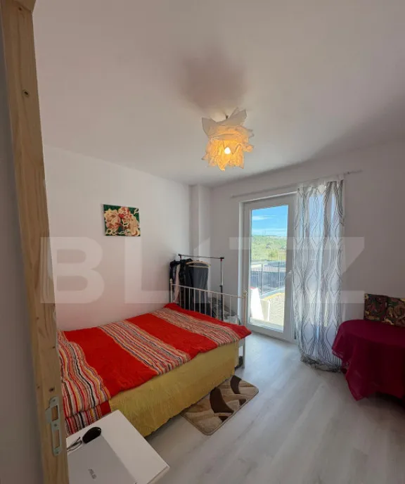 Dormitor matrimonial cu pat dublu, dulap și ieșire pe terasă