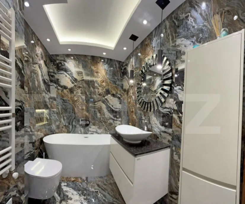 Dispune de bucătărie complet utilată, balcon și 2 băi: una cu duș walk-in și una cu cadă. Băile sunt finisate cu marmură.