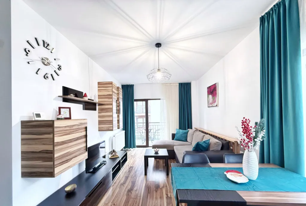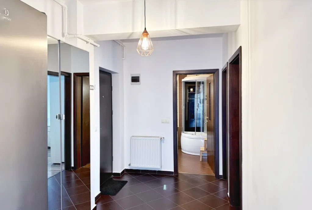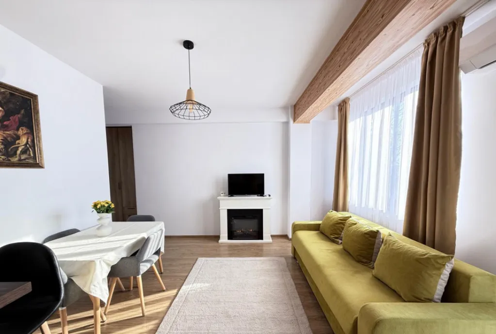 Apartamentul este amenajat cu bun gust si se închiriază mobilat și utilat la cheie, inclusiv frigider, aragaz, cuptor, mașină spălat rufe, aer condiționat , iar incalzirea se face cu centrala termica proprie.