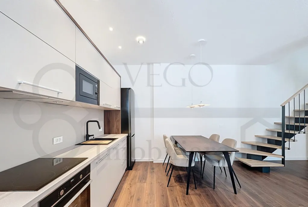 Locuința se află la prima închiriere, se desfășoară pe o suprafață utilă de 80 mp, se oferă spre închiriere complet finisată, mobilată și utilată, cu mobilier și electrocasnice noi, de înaltă calitate, conform fotografiilor de prezentare, iar confortul termic este asigurat pe tot parcursul anului de centrala termică individuală cu sistem de încălzire prin pardoseală la parter și calorifere la etaj și cele două aparate de aer condiționat.