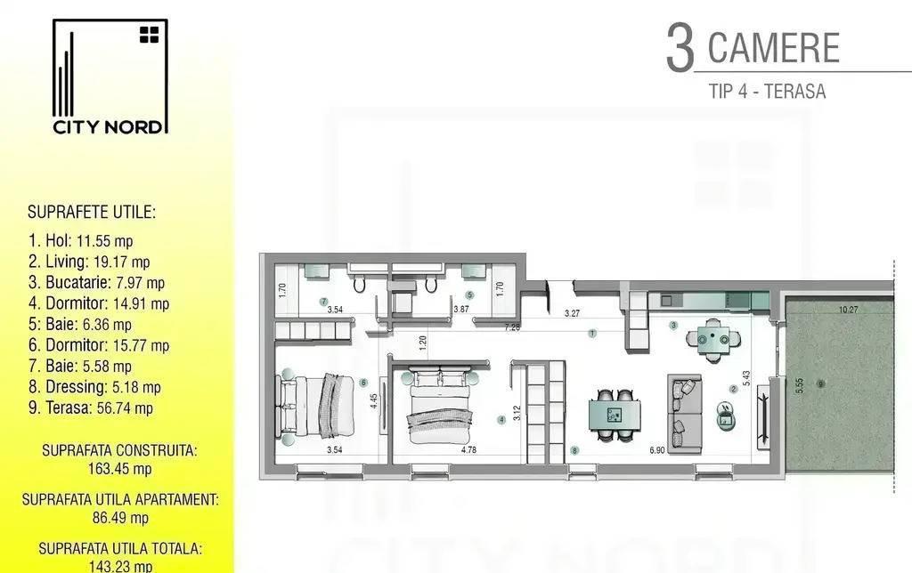 City Nord - 1 Decembrie Tunari COMISION 0 Apartament spatios cu 3 camere 2 bai dressing si o terasa impresionanta de peste 56 mp - tot ce iti poti dori pentru confortul familiei tale Suprafete utile Hol 11 55 mp Living 19 17 mp Bucatarie 7 97 mp Dormitor 1 14 91 mp Dormitor 2 15 77 mp Dressing 5 18 mp Baie 1 6 36 mp Baie 2 5 58 mp Terasa 56 74 mp Suprafata utila apartament 86 49 mp Suprafata utila totala 143 23 mp Suprafata construita 163 45 mp Avantaje principale Compartimentare decomandata spatii bine delimitate Bucatarie deschisa - functionala si aerisita 2 bai complet echipate Dressing dedicat - organizare optima Terasa de 56 74 mp - spatiu excelent pentru relaxare gratar loc de joaca sau zona verde privata Finisaje si dotari incluse predare la cheie o Incalzire prin pardoseala - Caleffi Italia o Parchet laminat 10 mm - Kronospan Germania nuanta stejar nobil o Placi ceramice premium 60x120 - Italia o Obiecte sanitare - ROCA Spania o Sistem electric - Schneider Electric Gewiss o Centrala termica proprie - Saunier Duval 24 kW o Tamplarie Salamander Tripan Structura si eficienta energetica o Constructie pe structura de beton armat o Zidarie portanta din caramida Porotherm de 30 cm o Pereti interiori din caramida - 11 5 cm o Izolatie exterioara polistiren EPS80 15 cm o Racordare completa la retelele publice de canalizare apa gaz si electricitate Ansamblu nou cu acces securizat locuri de parcare lift si infrastructura moderna Pozele sunt cu titlu de prezentare Suna acum si programeaza o vizionare Pozitionat ideal intr-o zona in plina dezvoltare aproape de Pipera A3 si DN1 VAUNT ID 101628
