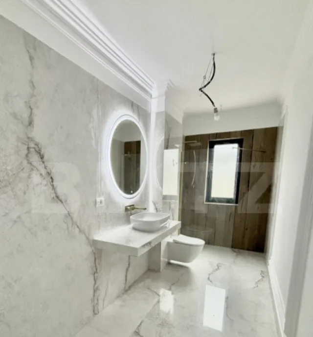 Interiorul este amenajat cu parchet SPC din gamă premium, rezistent și elegant, iar obiectele sanitare și lastrele ceramice sunt import Italia, atent alese pentru un design rafinat și atemporal. Tâmplăria beneficiază de triplă izolație, asigurând un excelent confort termic și fonic.