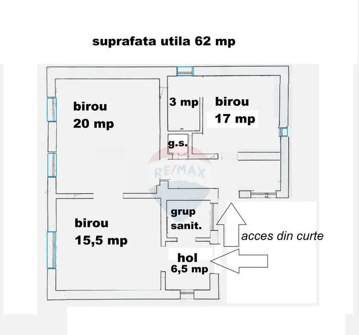 Spațiul are o suprafață utilă de 62 mp, compartimentată eficient si decomandat, oferind trei birouri, două grupuri sanitare și spații de depozitare, ideal pentru o organizare eficientă. Faptul că dispune de două uși de acces din exterior îți oferă flexibilitate operațională și posibilitatea de a separa fluxurile, iar curtea cu acces auto este un beneficiu major, rezolvând problema parcării.