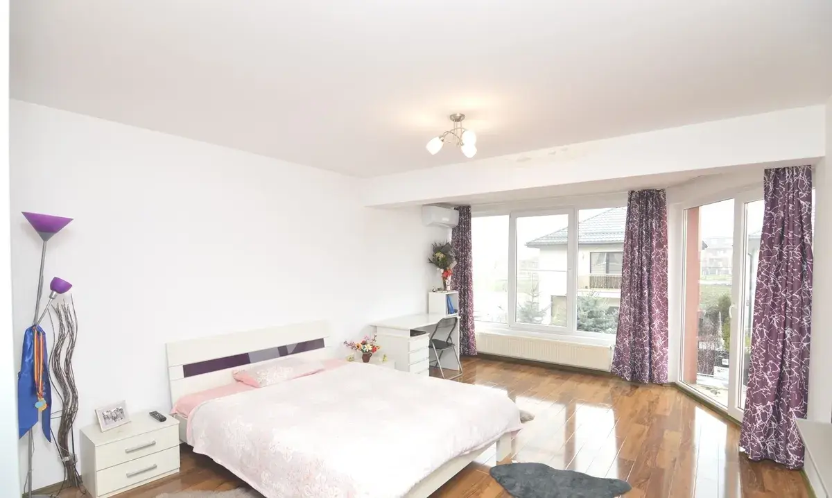 - etaj 1: 2 dormitoare matrimoniale cu baie proprie , hol generos, balcon .