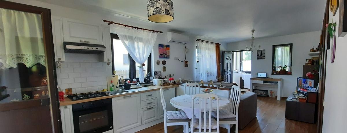 casa frumoasa noua cu potential de extindere rapida Daca doresti sa pleci din agitatia orasului te invit sa vezi o casuta cocheta eleganta abia construita 2023 pe parter si pod inalt mansardabil aflata la doar 23 de km de Bucuresti intr-o comuna ingrijita cu vecini prietenosi scoala gradinita centru medical deschis in permanenta cu doctor non stop statie peco spalatorie masini vulcanizare Langa casa se afla un magazin satesc cu de toate si zilnic trec vanzatori ambulanti cu legume fructe La 5 minute de mers cu masina sau microbuzul se gasesc megaimage Pepco profi farmacii CEC Bank cabinet veterinar aprozare fitofarmacie liceu etc Casuta care se vinde are langa ea si cabana din lemn de 20 mp care este izolata interior locuibila Casa a fost construita in regie proprie sub supravegherea noastra pentru folosinta proprie retragere de la sosea de 22 m S-au folosit cele mai bune materiale pentru siguranta confortul propriu si pentru eficientizarea consumului Printre altele la placa de jos izolatie polistiren tavan izolat cu rigips tevi in pardoseala de cea mai buna calitate preizolate cu copex termopane farest cu plase de tantati la toate geamurile tip storuri plase de tantari chiar si la geamurile de la cabana etc Casa are parter 62 mp cu living deschis cu bucataria 1 dormitor camera tehnica care acum este folosita ca dressing si depozitare baie si 2 terase Are pod inalt mansardabil cca 60 mp Podul are placa de beton si acces exterior pe o scara frumoasa din lemn In mansarda se poate amenaja un apartament cu intrare separata Cabana din lemn este locuibila are 20 mp este izolata interior are fundatie si este acoperita cu tabla lindab are curent electric si prize