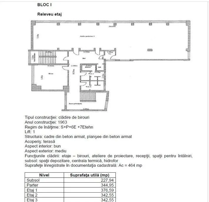 - corpul 1, cu regim de inaltime S+P+5E+1E tehnic, cu suprafata utila de 2.702,65 mp, construit in anul 1963;
