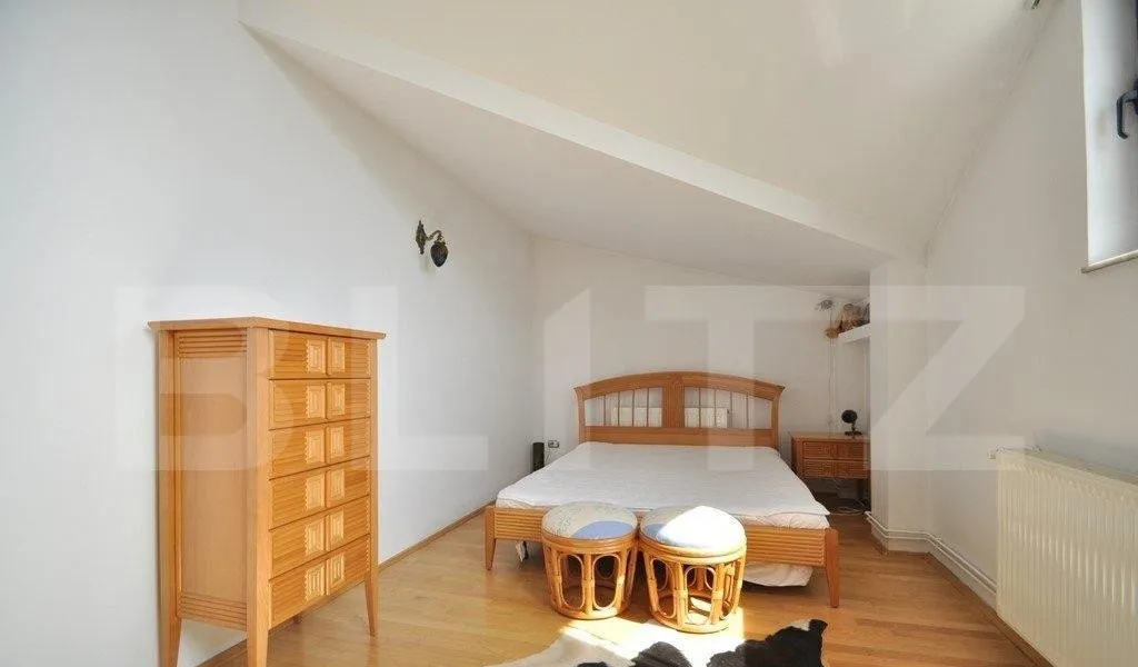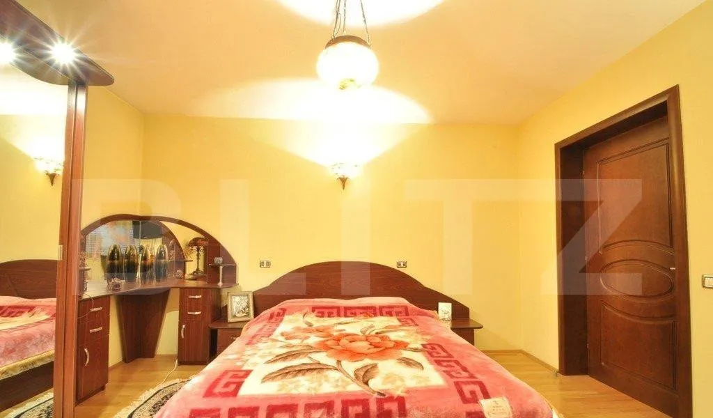 Dormitoare foarte spatioase, luminoase, cu balcon spatios, garaj inchis cu acces in camera tehnica si intrarea de serviciu in casa + curte cu spatiu de relaxare si parcare autoturism.
