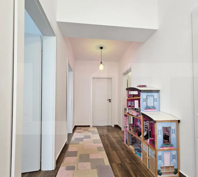 Etaj: două dormitoare confortabile, baie cu geam și hol generos.