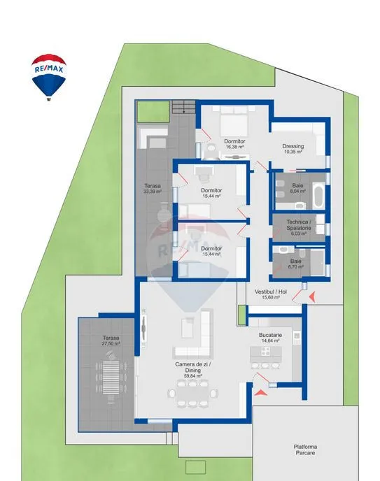 Băi: 2 băi, una cu acces direct din dormitorul matrimonial