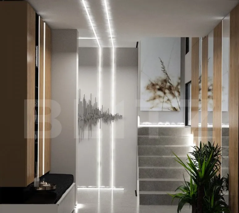 Casa face parte dintr un proiect rezidential exclusivist de 4 case, individuale, cu intrare privata, asigurata cu bariera, si este alcatuita pe plan parter din: