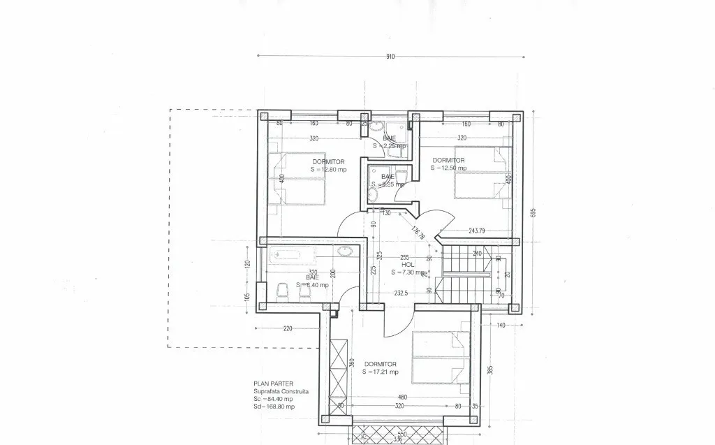 Etaj: dormitor matrimonial 17,2 mp cu baie proprie de 6,4 mp și balcon de 2,5 mp, hol 7,3 mp, două dormitoare în oglindă (12,8 mp fiecare) cu băi proprii de câte 2,5 mp.