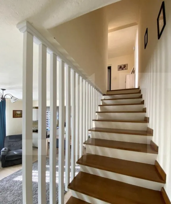 De la etaj exista acces pentru podul casei si acesta poate fi folosit inclusiv ca si extra spatiu de depozitare.
