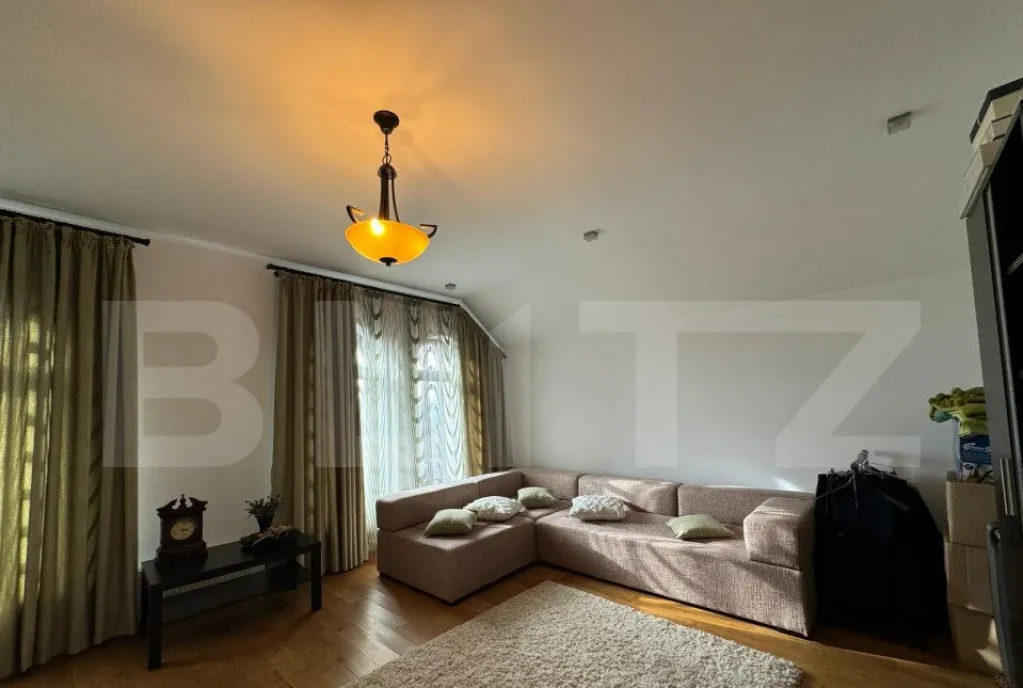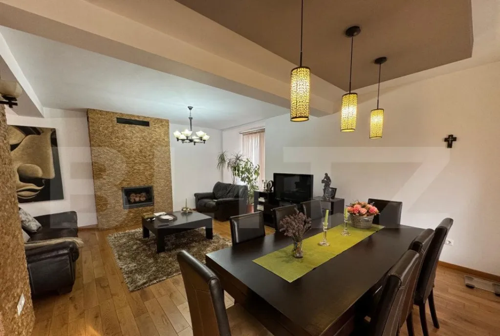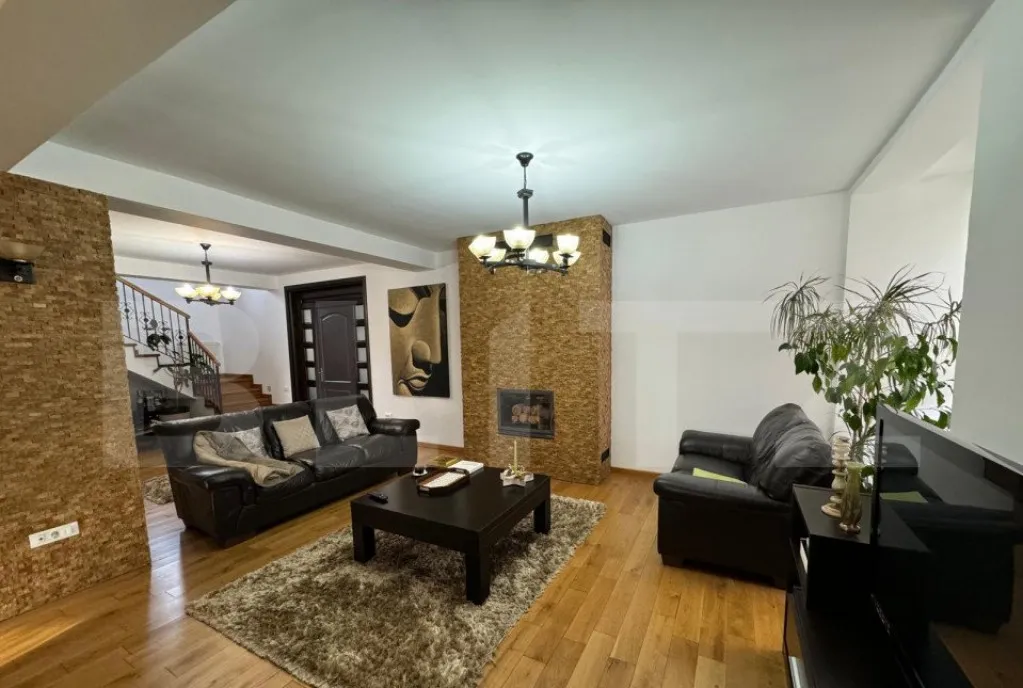 - La parter, veți găsi un living spațios cu semineu, bucătărie modernă, un birou, o baie și camera centralei.