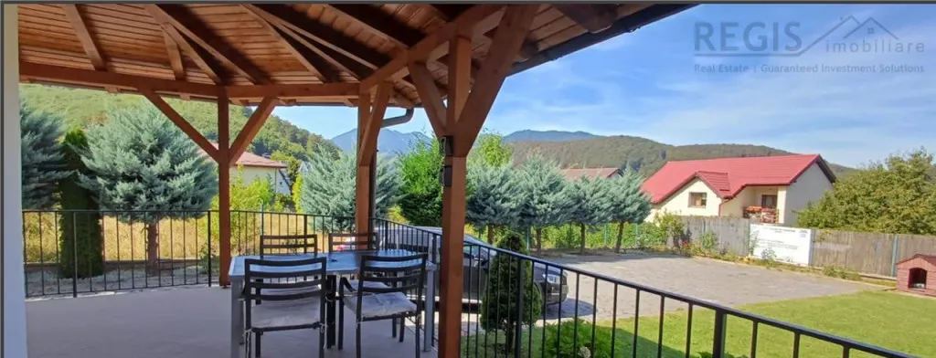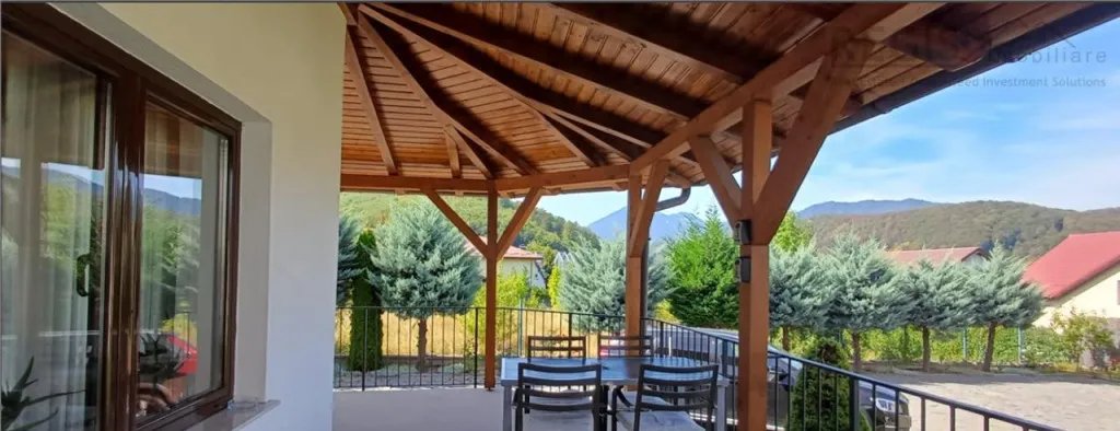 Din livingul dotat cu semineu functional si mobilier cu specific traditional,se iese intr o terasa care ofera o priveliste incantatoare asupra muntilor si curtii interioare ,unde trandafirii,gazonul si arborii creaza ambianta de ACASA.