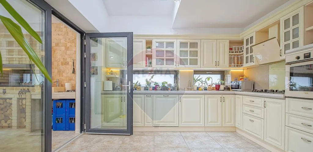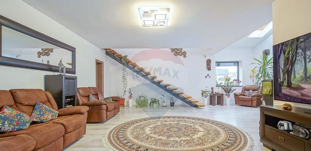 Casa este dispusă pe demisol, parter și etaj și oferă mult spațiu, lumină și flexibilitate: 7 camere, 2 bucătării, 4 băi, 3 holuri, balcon și garaj cu utilități.