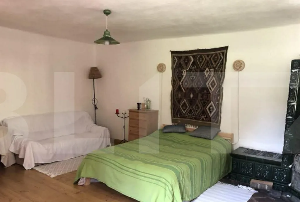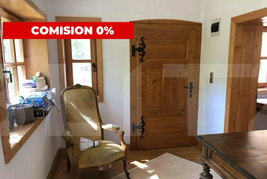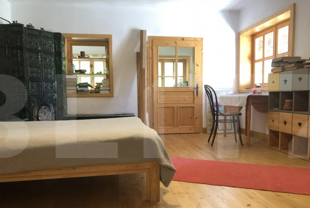 Interiorul se remarcă printr-un stil rustic autentic, pus în valoare de lucrături unicat din lemn masiv, sobele de teracotă, care conferă casei căldură, personalitate și un caracter aparte. Compartimentarea casei este în format L, cu 2 intrări separate: o intrare în bucătărie, pe stânga baia si cămara, pe dreapta vin 2 camere spațioase, un debara și a treia cameră cu ieșire directă în curte. Proprietatea se vinde nemobilată, eventual se discută prețul mobilierului separat.