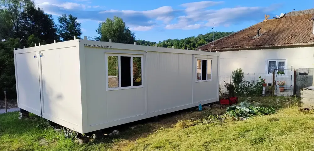 Casa modulara este noua noiembrie 2024 neutilizata in garantie avand o suprafata de 48 mp fiind pozitionata pe piloni pentru a fi asigurata ventilatia si pentru a se evita condensul