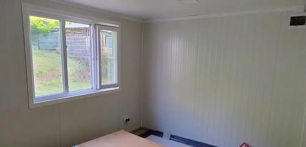 Casa este compartimentata astfel doua dormitoare baie si living open-space cu spatiu prevazut pentru bucatarie Este dotata cu instalatie electrica completa intrerupatoare prize doua tablouri de sigurante si doua impamantari precum si cu sistem de prindere acoperis si/sau panouri fotovoltaice