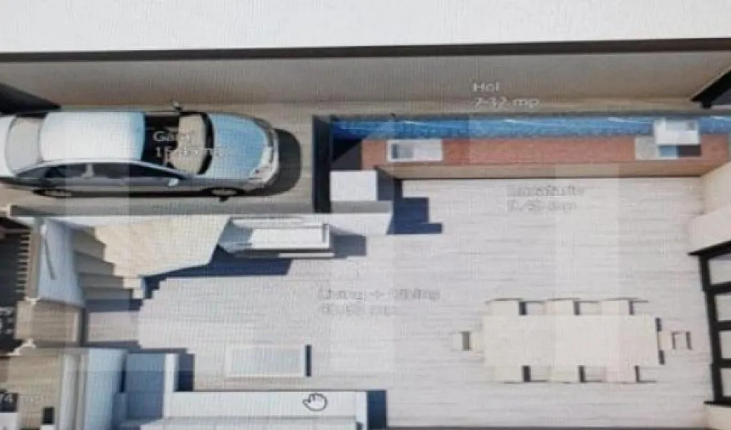 În spatele casei există o curte amenajată ca spațiu verde, împrejmuită cu gard de beton.