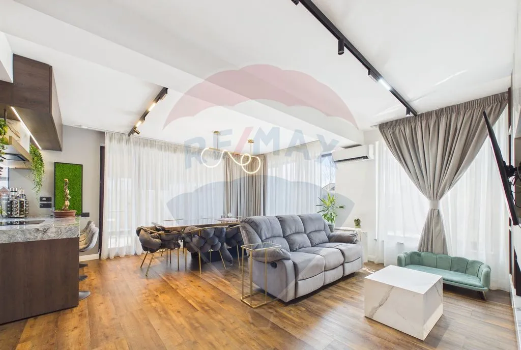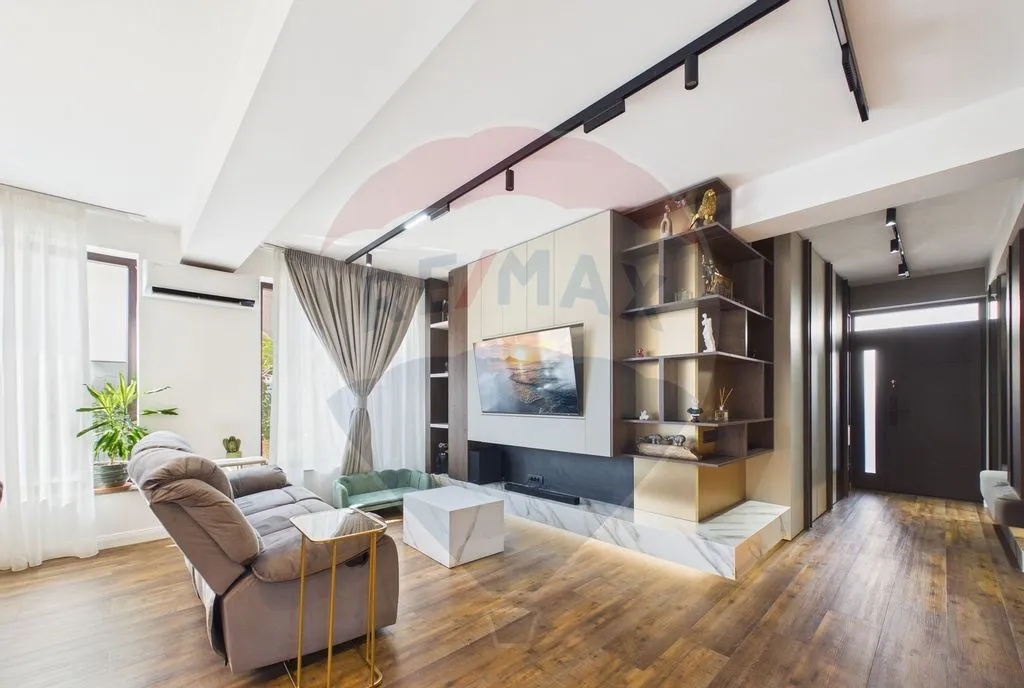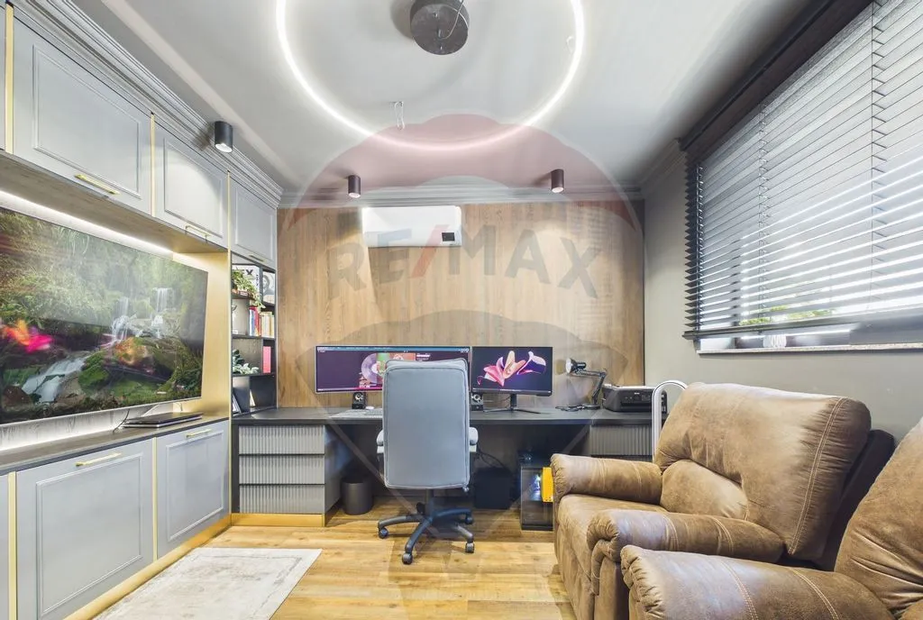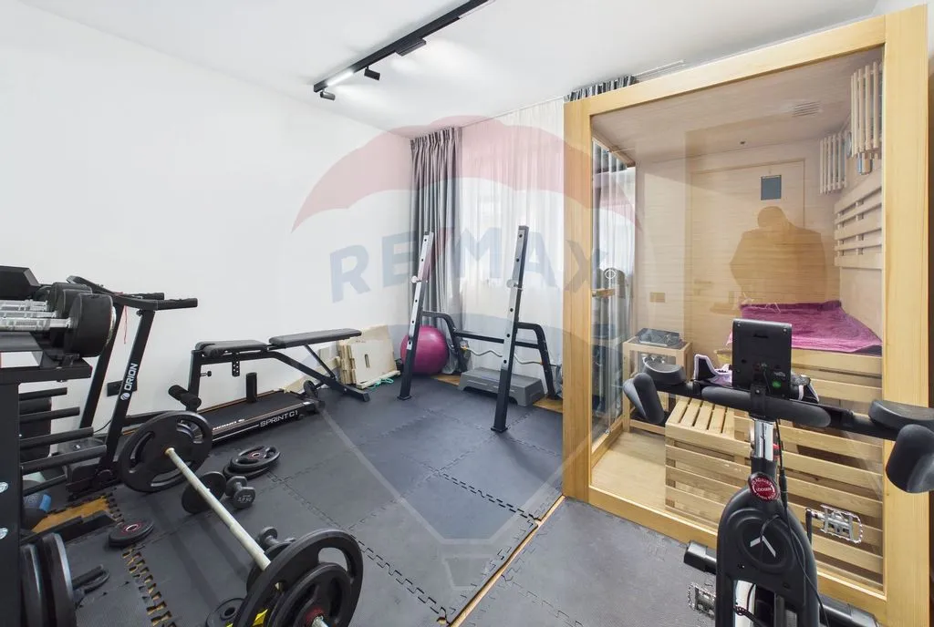 Interiorul este amenajat în stil contemporan, cu living generos și zonă de dining, 2 dormitoare, birou, cameră dedicată sală de fitness și saună, dressing-uri multiple și mobilier realizat pe comandă. Finisaje premium: lavabilă decorativă 3D, iluminat LED și proiectoare încastrate, uși filomuro, parchet triplu stratificat herringbone la etaj și SPC rezistent la apă la parter.