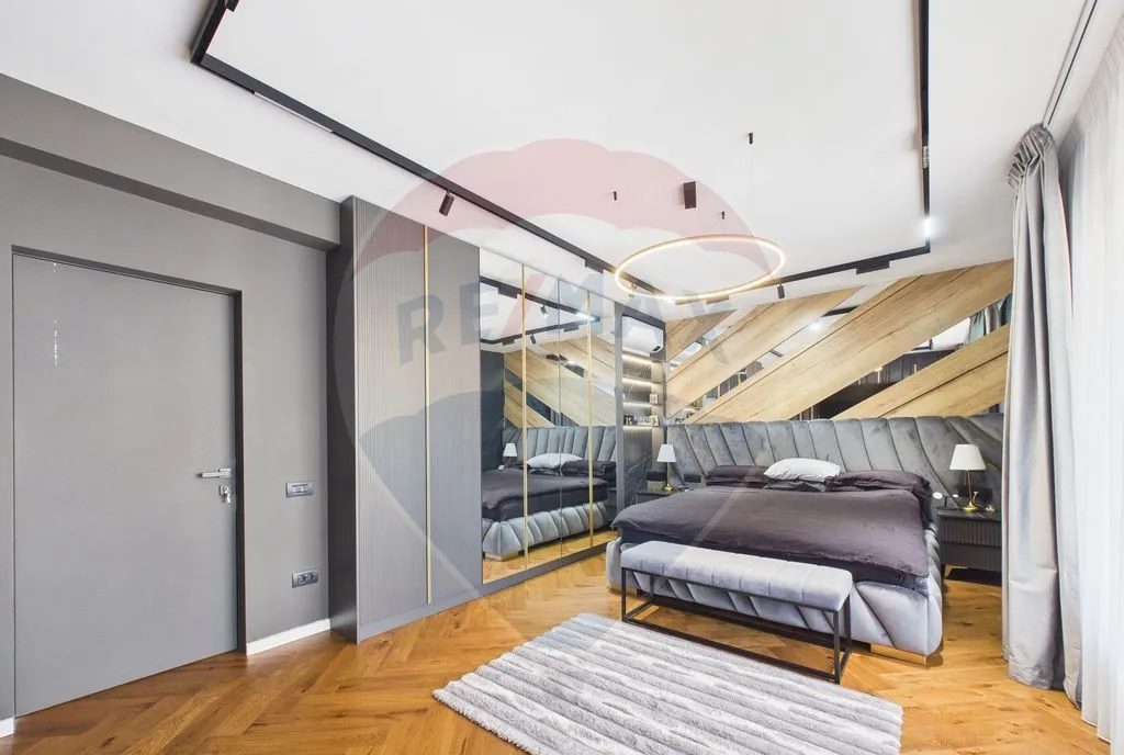 Etaj – dormitor matrimonial cu baie proprie, dressing și balcon, cameră fitness/saună, cameră dressing, baie cu cadă freestanding, acces către pod înalt mansardabil.