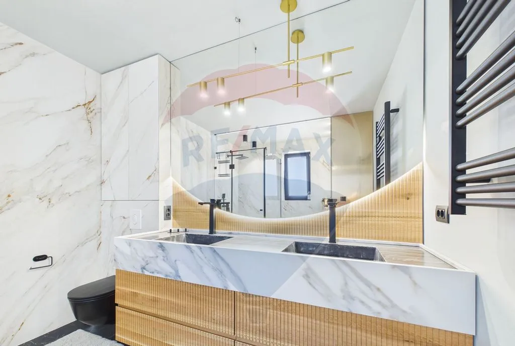Proprietatea dispune de 3 băi ultramoderne: 2 cu duș walk-in și 1 cu cadă freestanding, placate cu materiale ceramice premium din Italia și Spania.