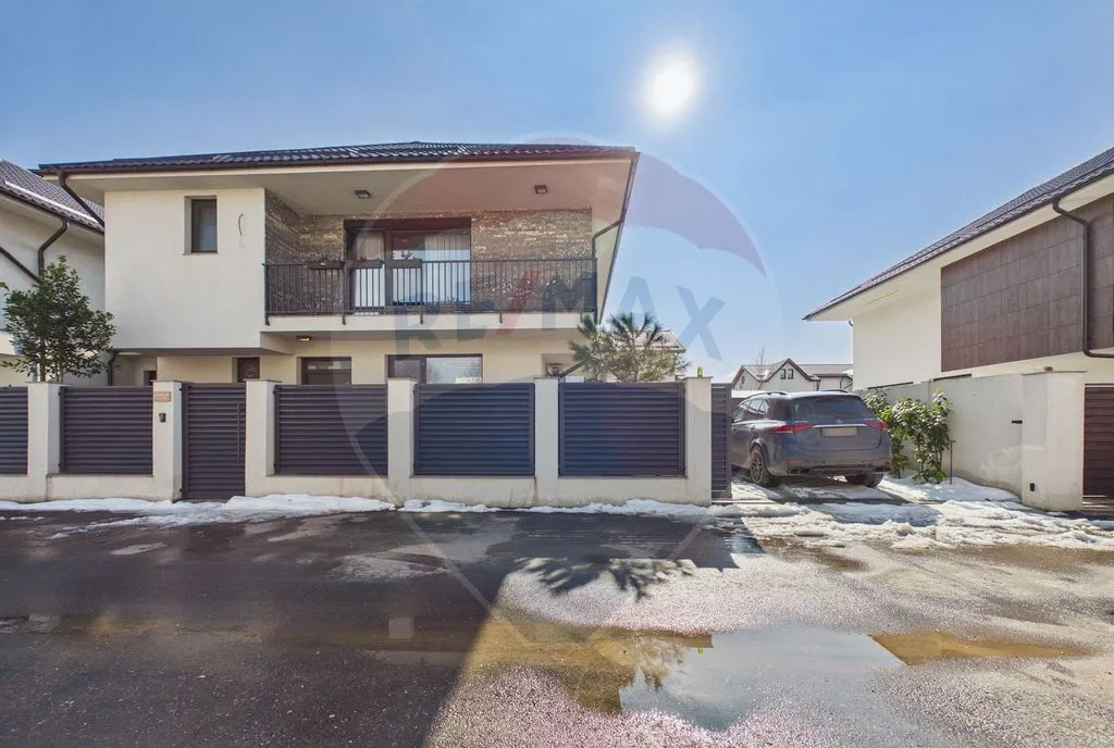 Exteriorul oferă o zonă premium de relaxare: terasă placată cu granit C7 (aprox. 130 mp), piscină încălzită cu pompă de căldură și sistem automat de dozare clor, terasă acoperită cu zonă lounge și TV, utilități pregătite pentru bucătărie de vară, grădină amenajată cu peste 18 tipuri de plante, iluminat exterior ambiental, 4 magazii de depozitare, parcare pentru 2 mașini în curte, poartă auto cu telecomandă și aplicație mobilă, poartă pietonală cu interfon, video-interfon și acces cu amprentă/cod.