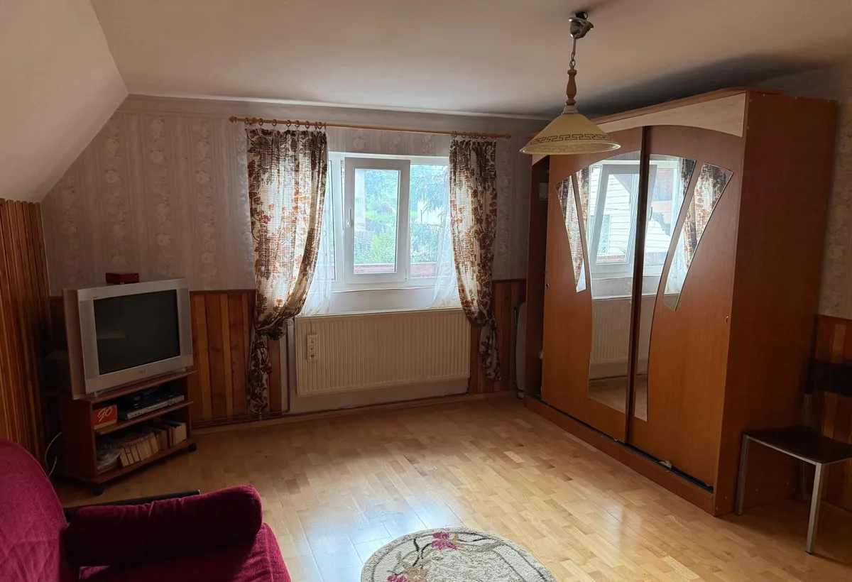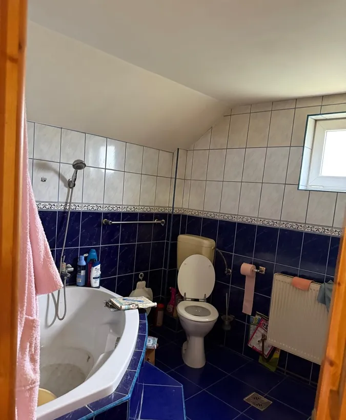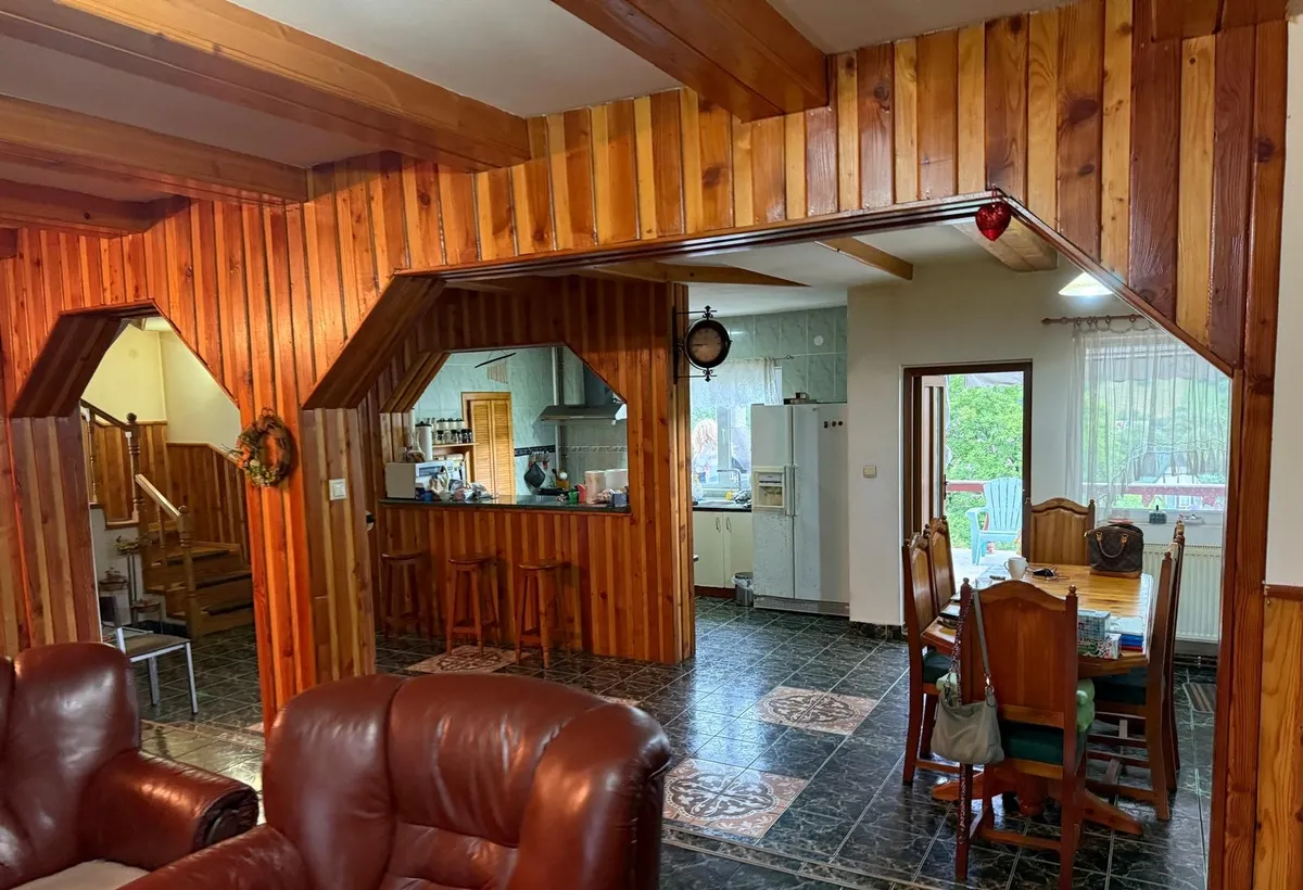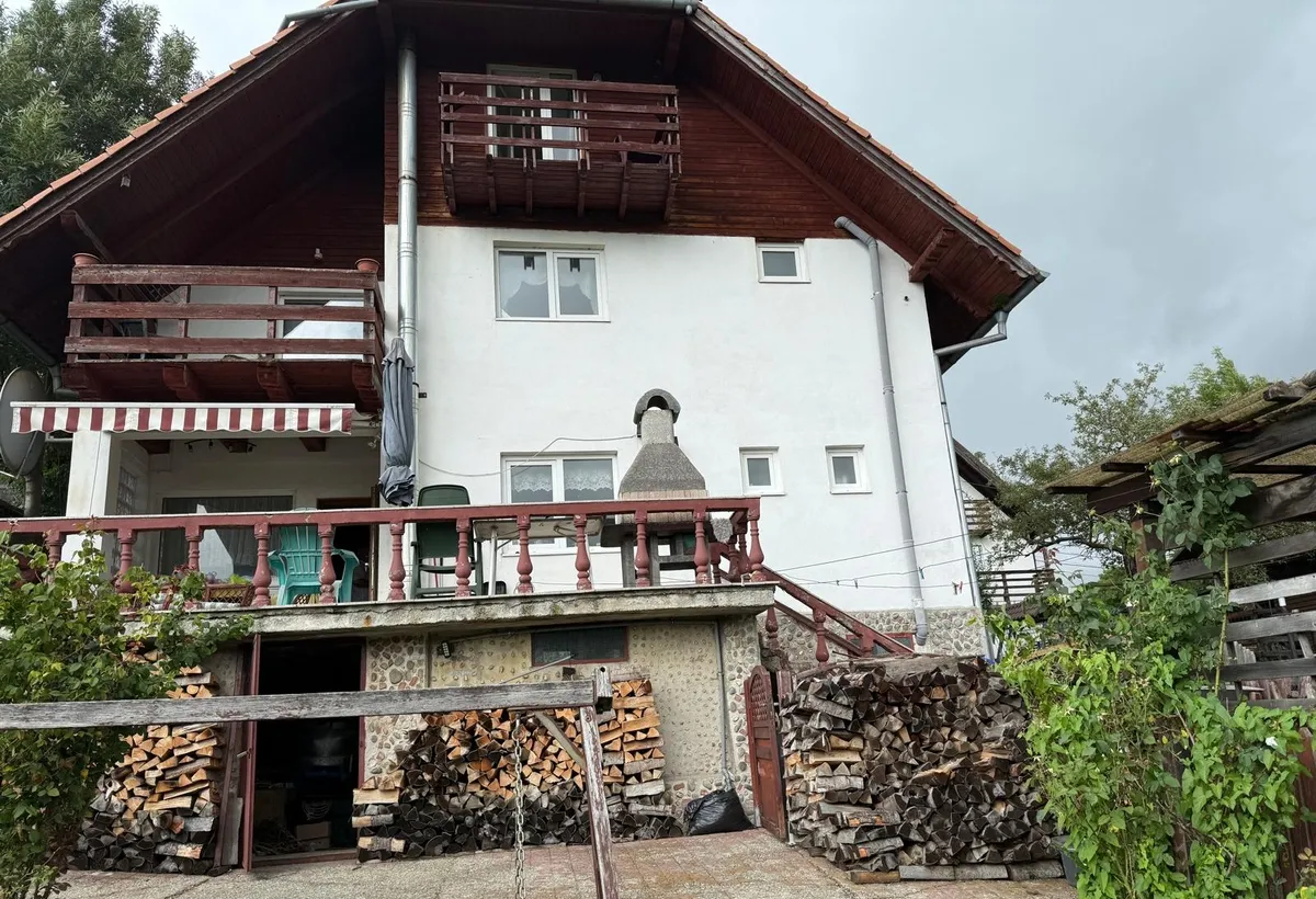 Casa vila reprezentativa D+P+1+M, constructie 2003, 7 camere, 4 bai, 3 balcoane, terasa de 15 mp, constructie cu plansee de beton si zidarie din caramida si BCA, la cheie. Gaze, canalizare pe strada, peisaj de vis.